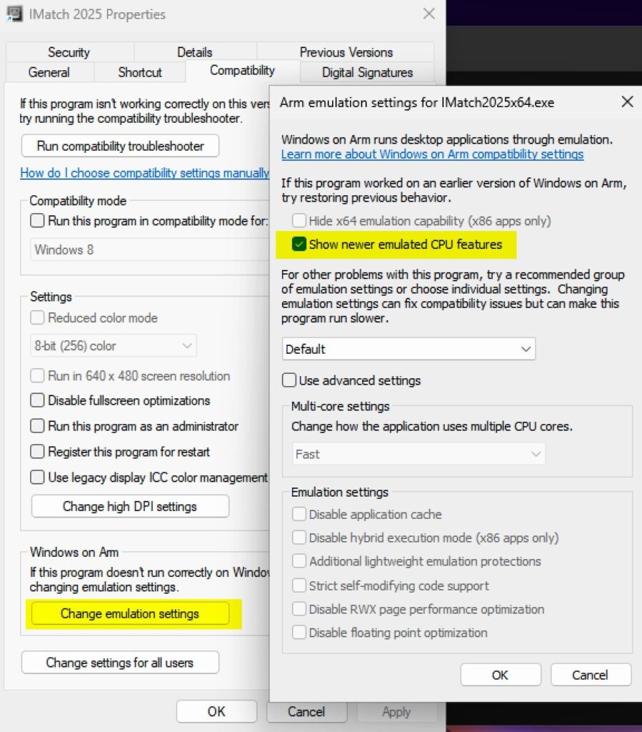 In order to make IMatch work on Windows on ARM, right-click on the IMatch icon on the desktop and choose Properties. In the Properties dialog, click on the Compatibility tab and enable the option as shown in yellow in the screen shot below.